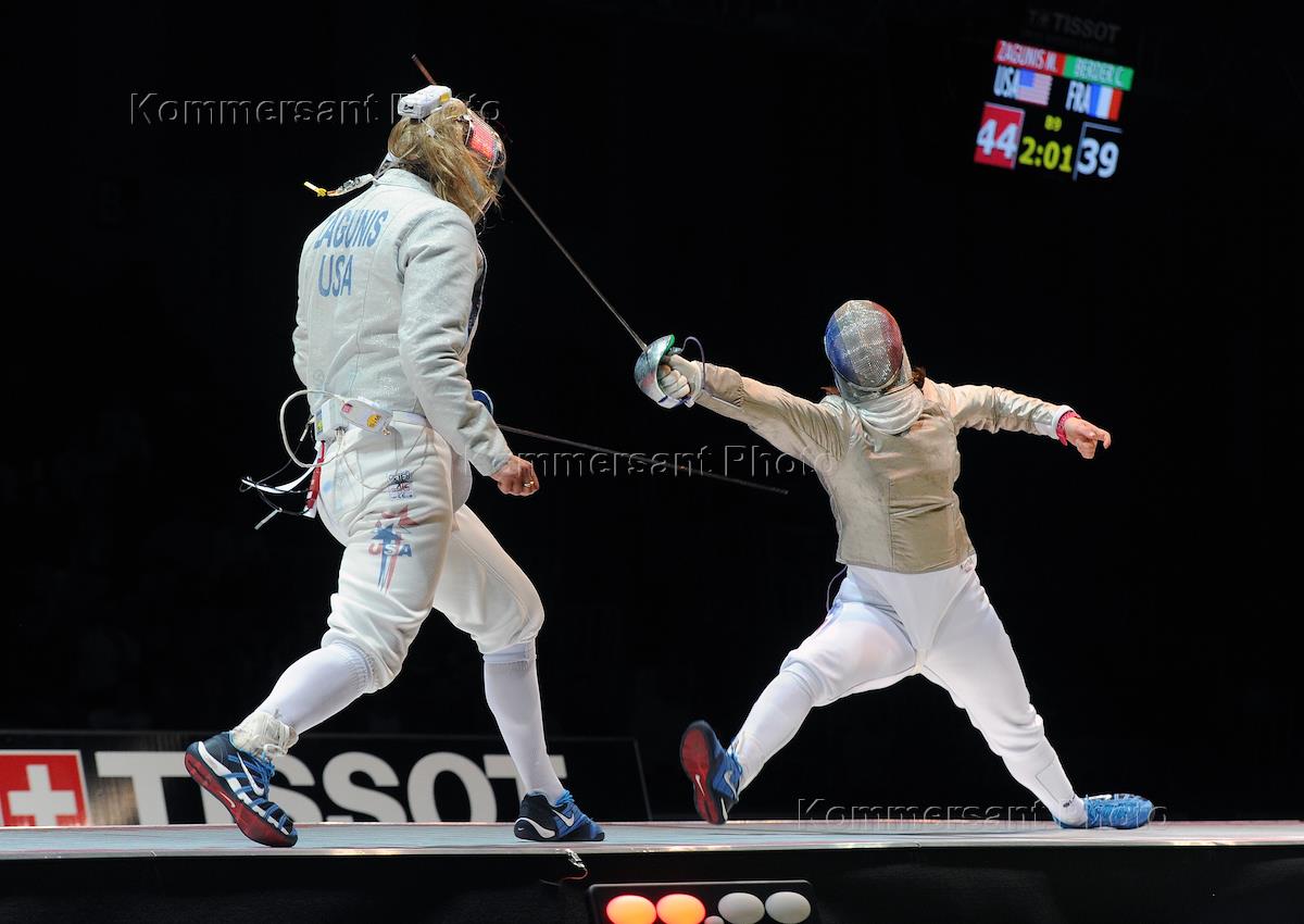Чемпионат мира по фехтованию 2014. Член сборной США Мариэль Загунис (слева) и член сборной Франции…