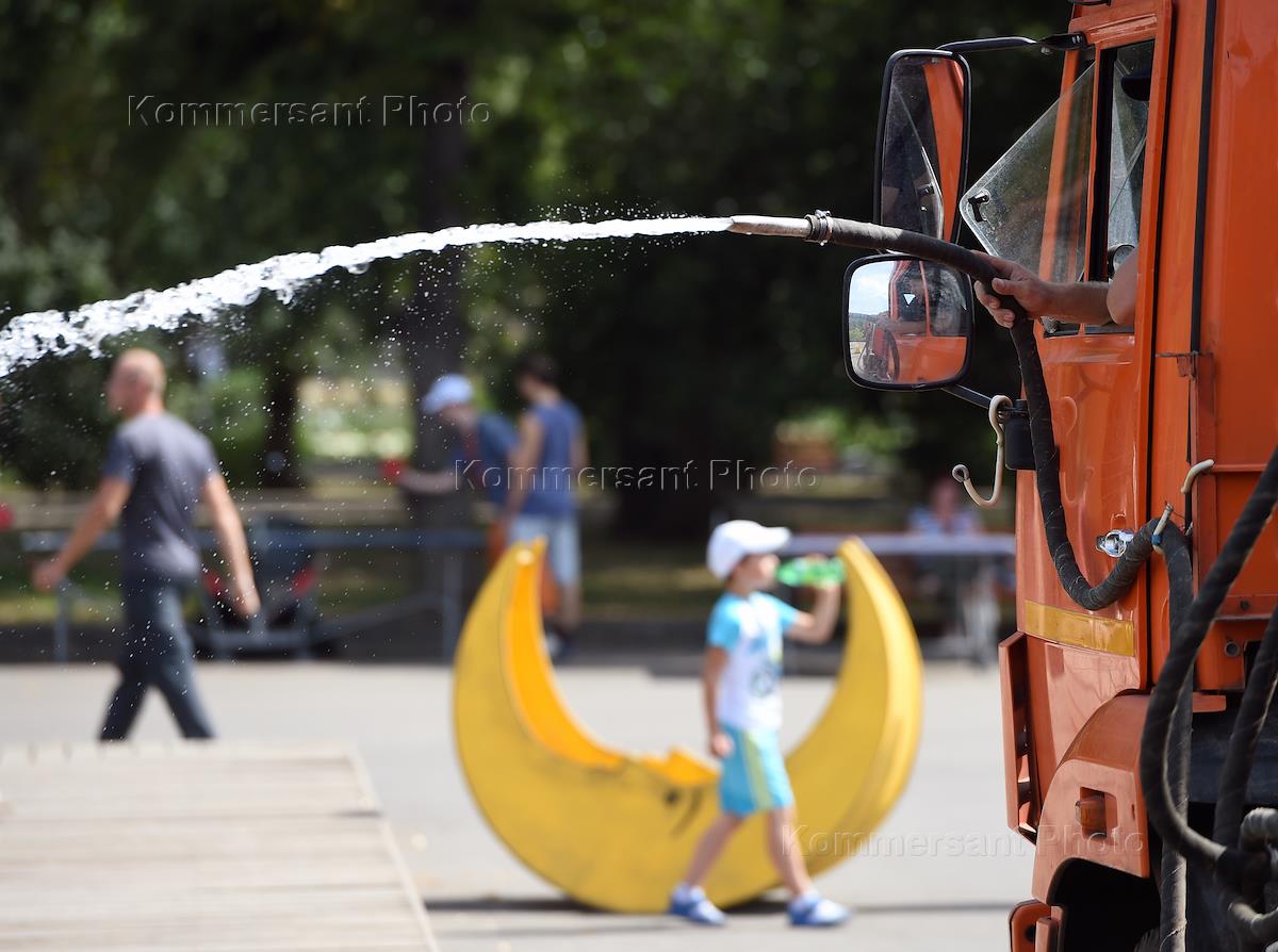 Жара в Москве. Девушка у поливального шланга в Парке культуры и отдыха им. М.Горького.