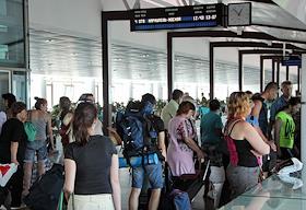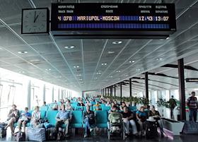 Жанровая фотография. Железнодорожный вокзал Донецка. Пассажиры в зале ожидание. На табло "Мариуполь…