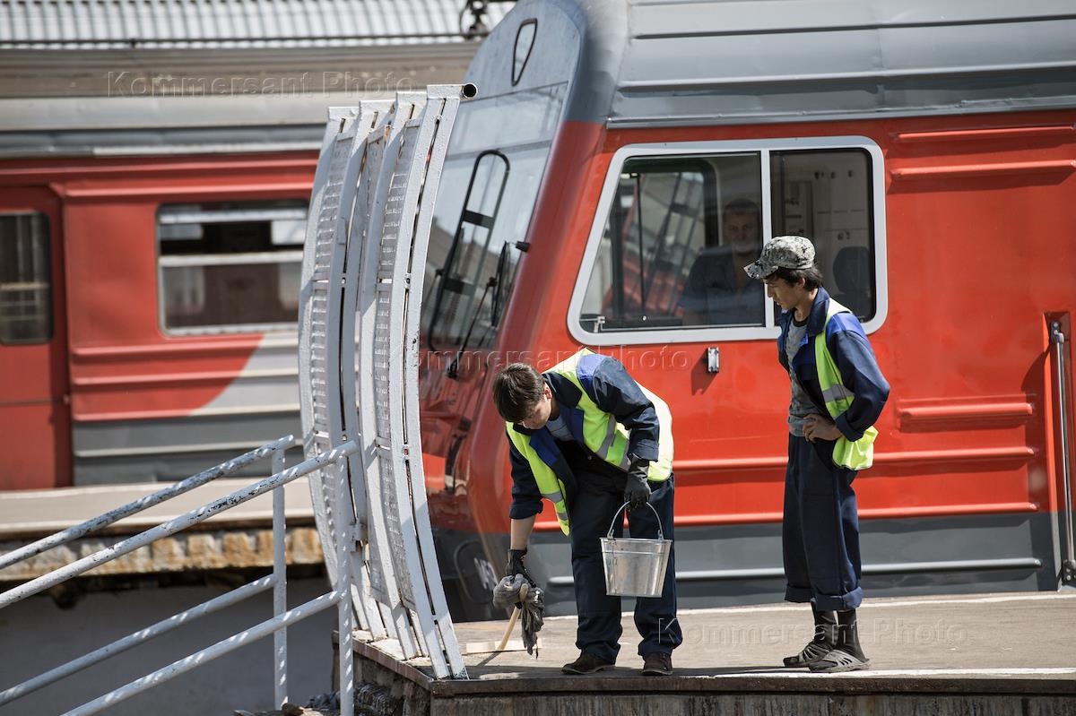 Жанровая фотография. Дворники на платформе на Савеловском вокзале.