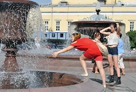 Жара в Москве. Девушки у фанта на Театральной площади.