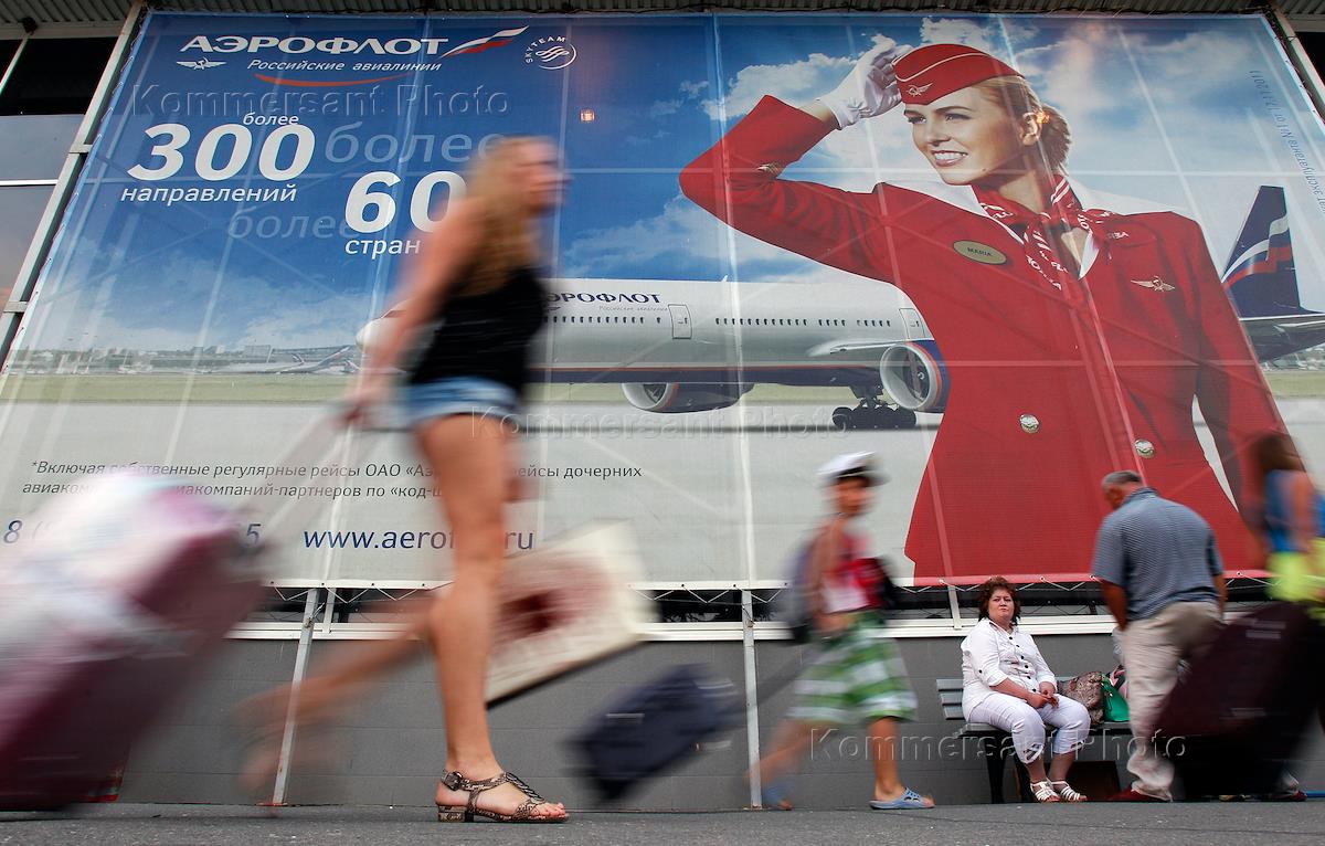 Жанровая фотография. Пассажиры в аэропорту Симферополя. Рекламный плакат авиакомпании "Аэрофлот".
