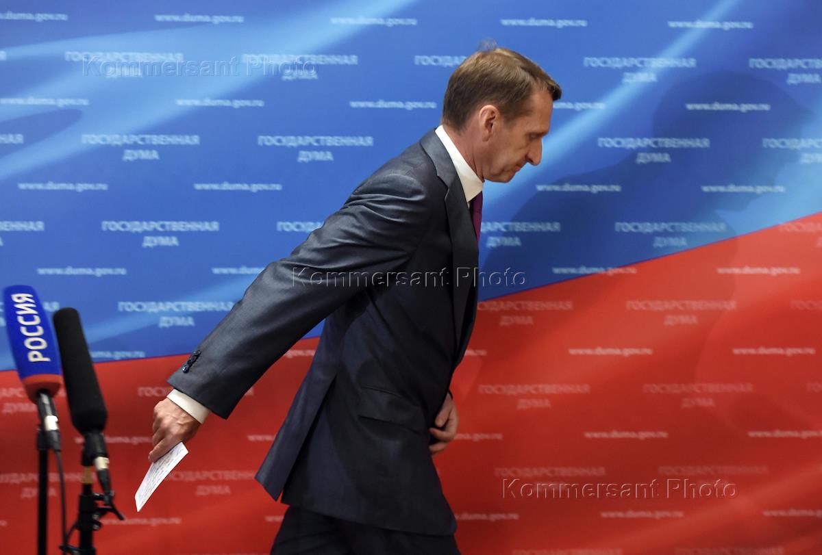 Председатель Государственной думы (ГД) России Сергей Нарышкин после окончания встречи с прессой,…