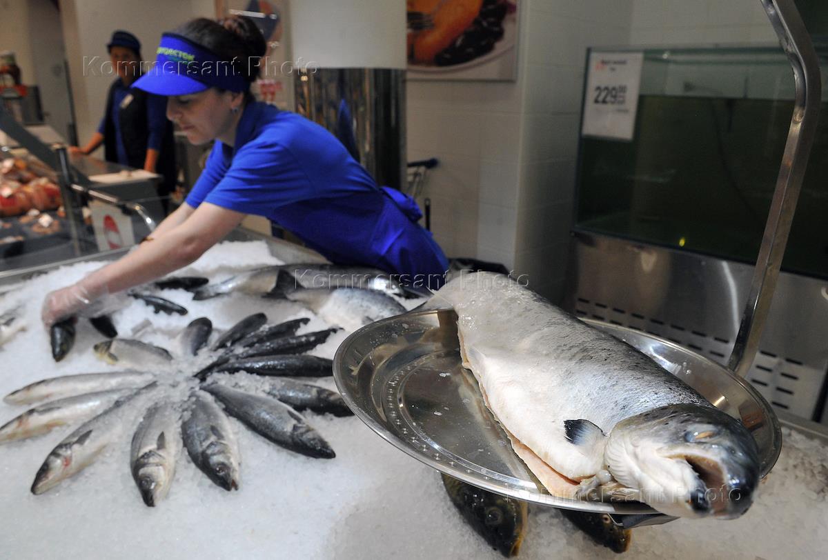 Продавец рыбного отдела выкладывает рыбу на лед в супермаркете "Перекресток".