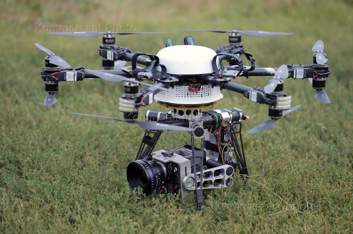 Тестовый взлет беспилотного аппарата, осуществляющего профессиональную аэросъемку, видеосъемку кино…