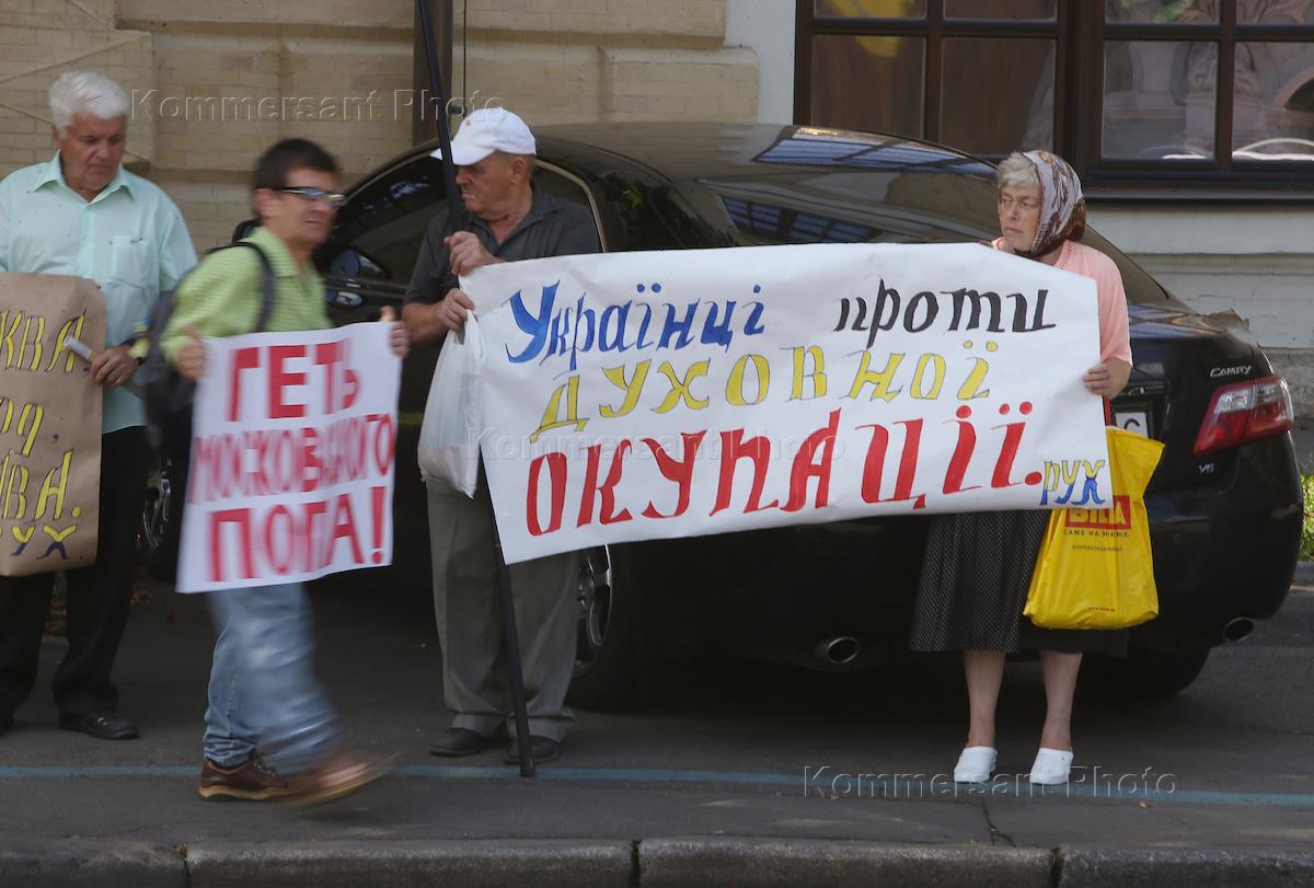 Акция выступающих против избрания предстоятелем Украинской православной церкви (УПЦ) Московского…