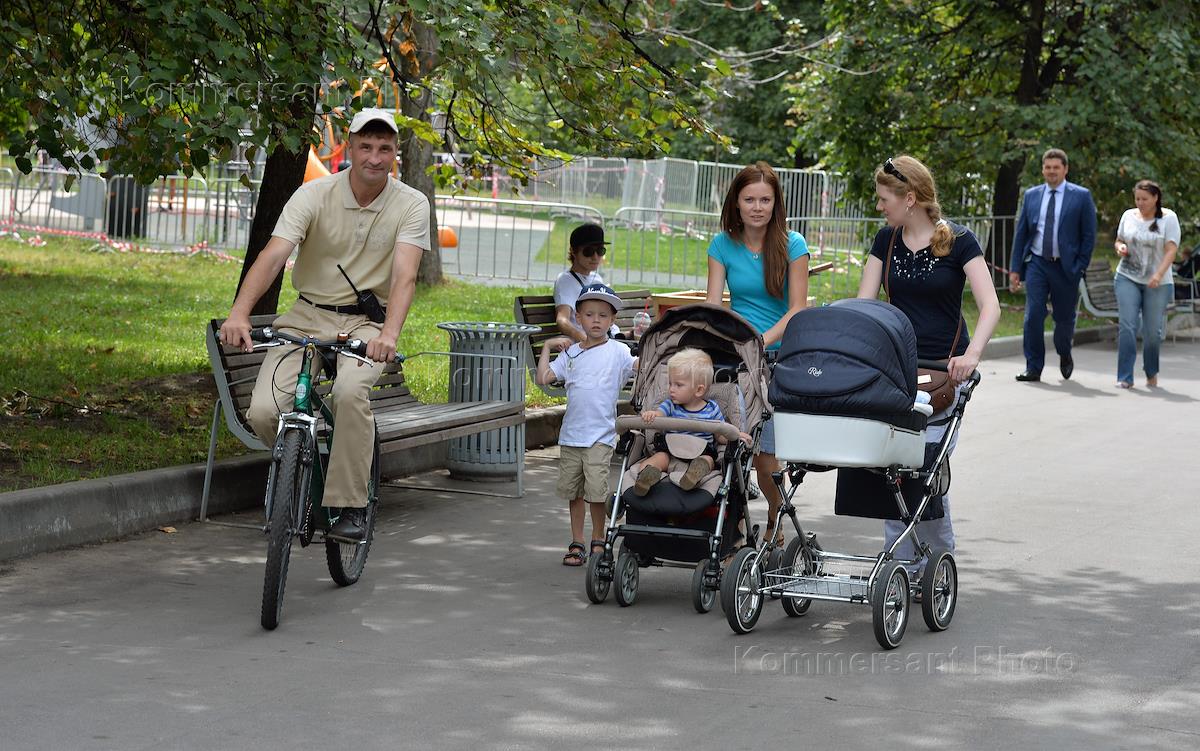 Охранник парка "Красная пресня" Алексей Пышнев на велосипеде во время дежурства в парке.