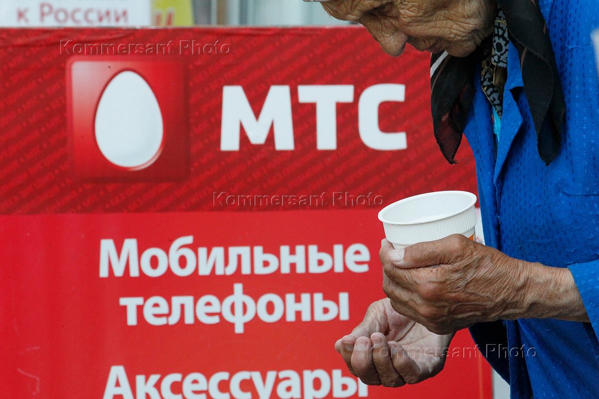 Жанровая фотография. Пожилая женщина просит милостыню на фоне рекламы оператора связи "Мобильные…
