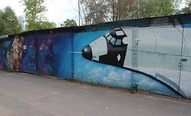 Проспект Космонавтов. Граффити на космические темы на стенах гаражей внутри квартала на проспекте Космонавтов.