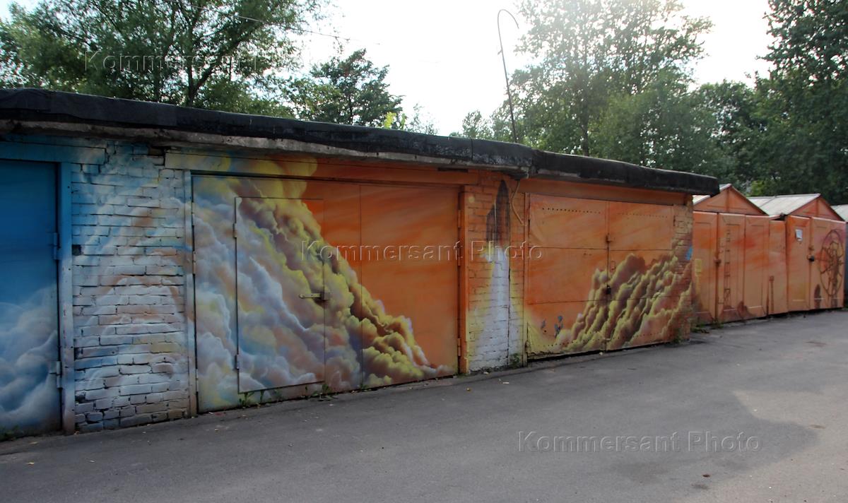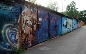 Виды Санкт-Петербурга. Проспект Космонавтов. Граффити на космические темы на стенах гаражей.