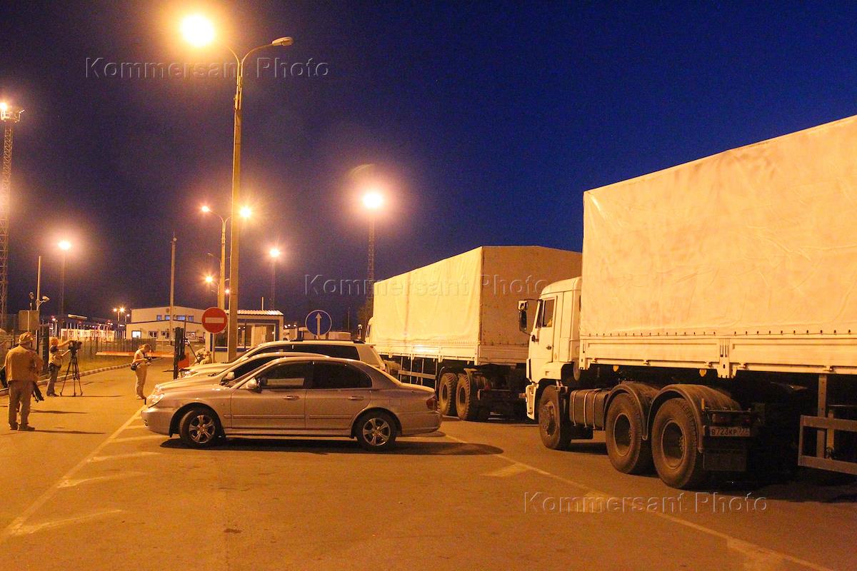 Гуманитарный конвой. Машины из колонны с гуманитарной помощью на границе Украины и России на КПП "Донецк-Изварино".