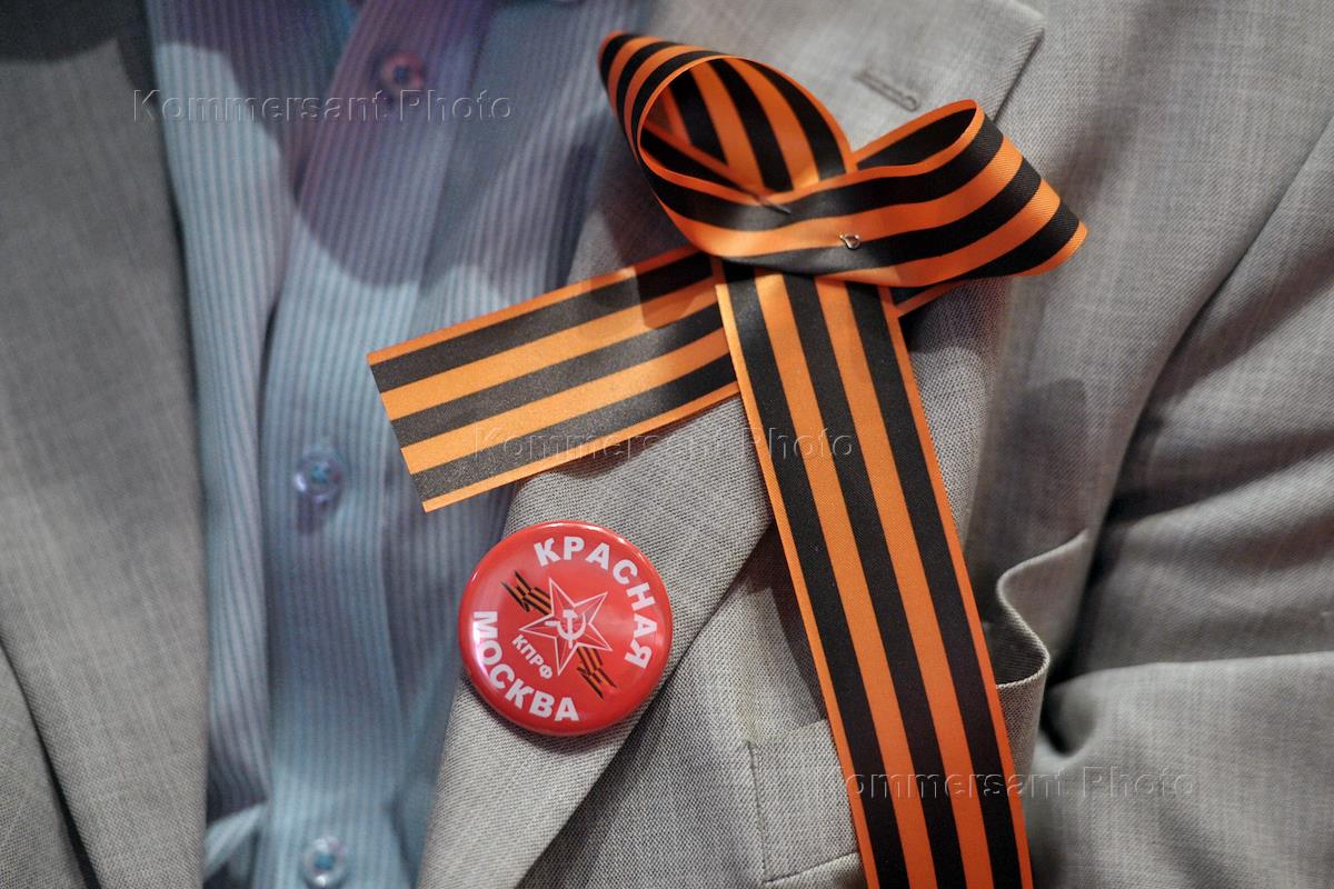 Жанровая фотография. Георгиевская ленточка на пиджаке и значок КПРФ "Красная Москва".
