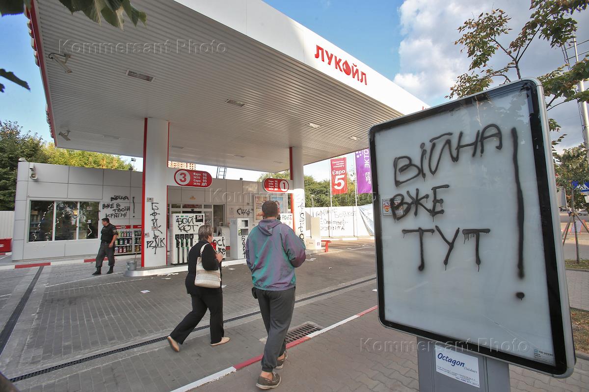 Российская АЗС "Лукойл", атакованная участниками инициативы "Бойкот российских АЗС" в Киеве. Надпись…