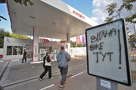 Российская АЗС , атакованная участниками инициативы "Бойкот российских АЗС", в Киеве.