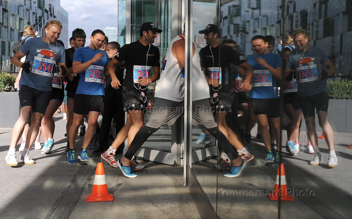 Ежегодный скоростной "Забег в высоту" на верхний этаж небоскреба "Город Столиц". Участники во время…