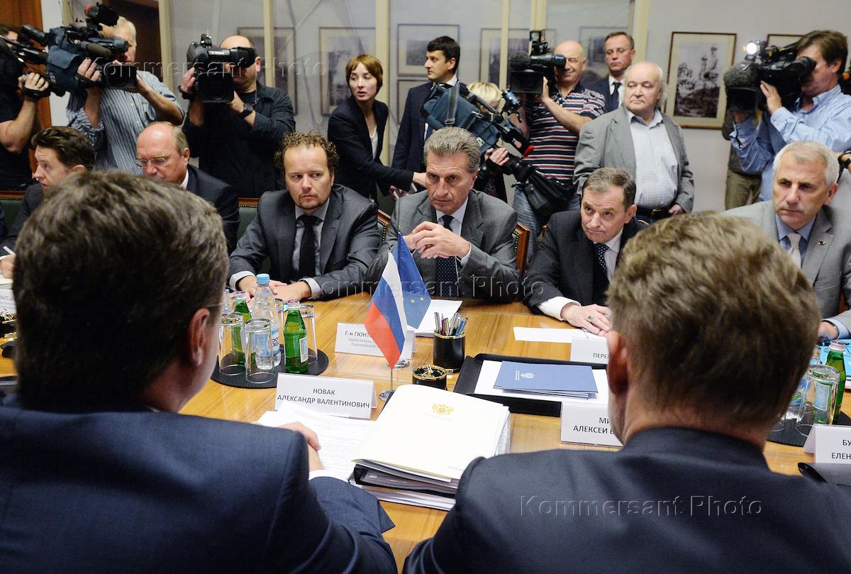 Комиссар по энергетике Европейской комиссии Гюнтер Эттингер (в центре) во время встречи с министром…