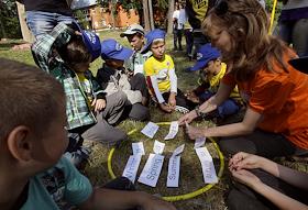 Детский оздоровительный лагерь "Старая Руза". Мальчик у стенда "65 лет любимому лагерю".