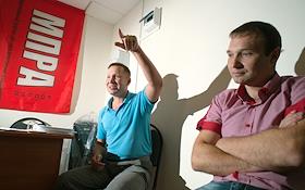 Лидеры профсоюзного рабочего движения заводов Калужской области Дмитрий Кожнев (слева) и Дмитрий…