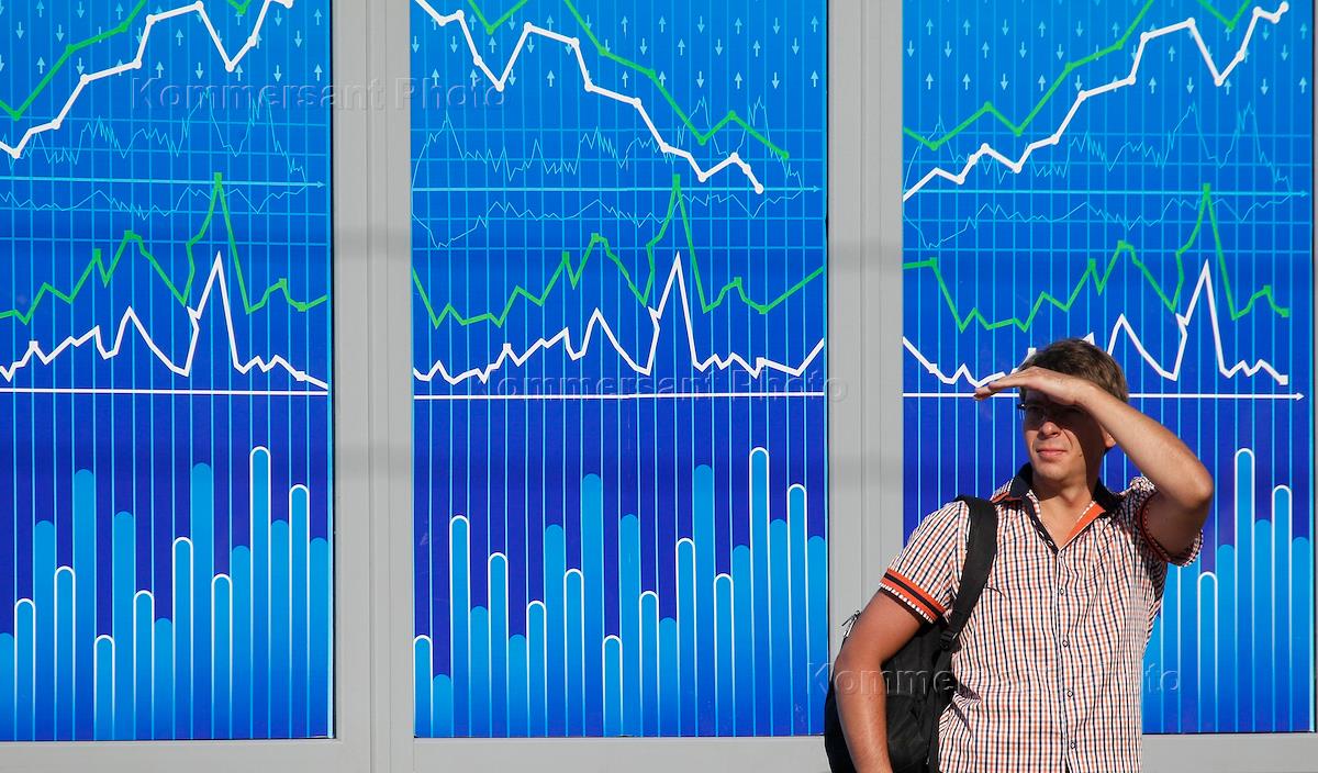 Жанровая фотография. Молодой человек стоит у стенда с графиками и диаграммами торговой компании…
