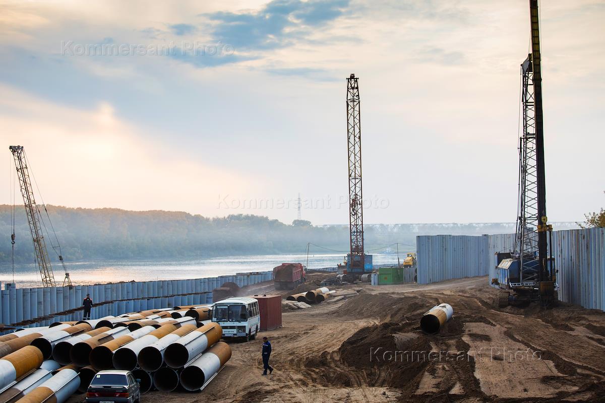 Виды Уфы. Работники городских служб наблюдают за стротительством набережной реки Белой.