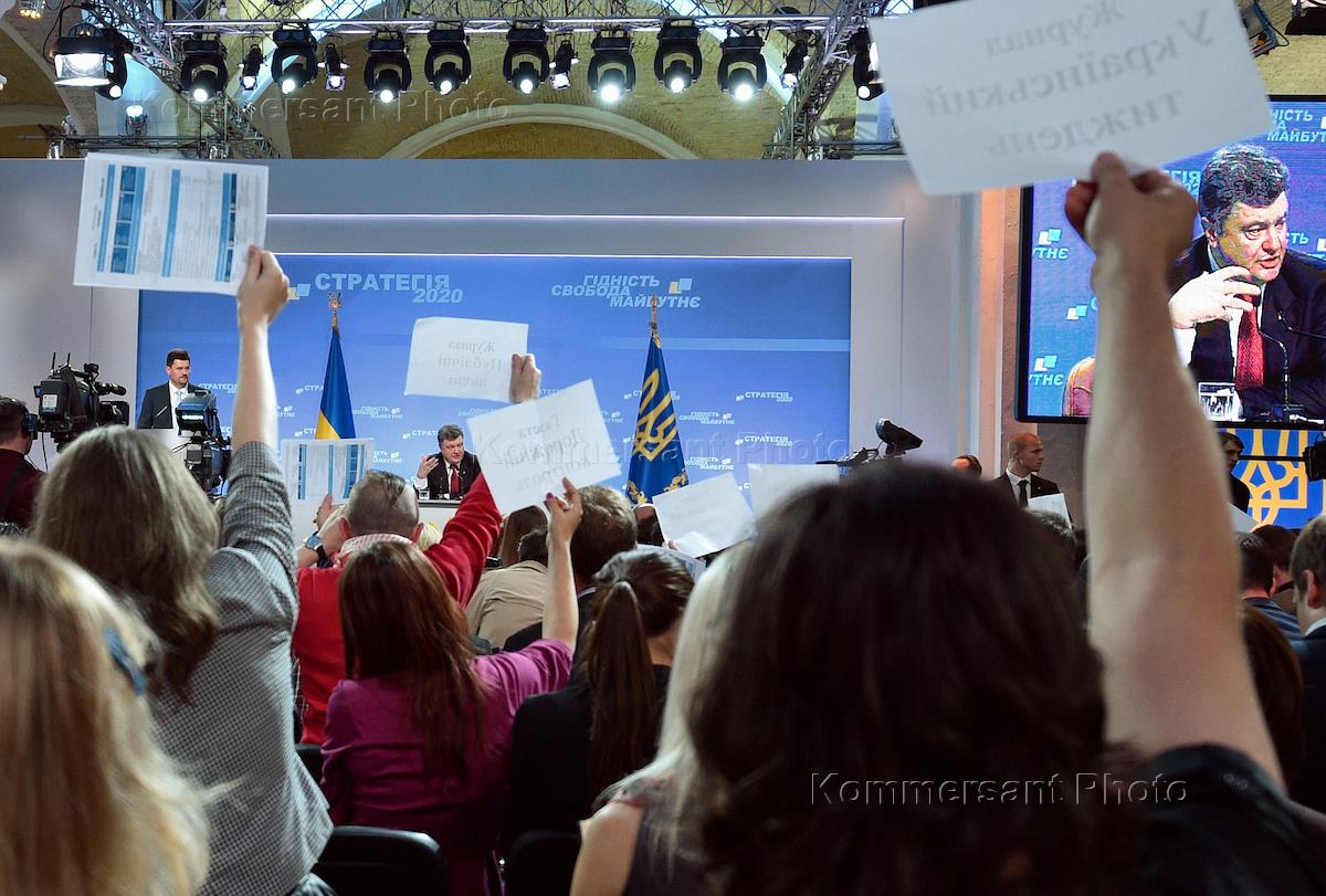 Президент Украины Петр Порошенко (в центре) во время пресс-конференции.
