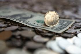 Жанровая фотография. Монета 1 рубль на денежной купюре достоинством 1 доллар.