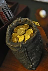Жанровая фотография. Мешочек с монетками номиналом в 1 копейку на рабочем столе.