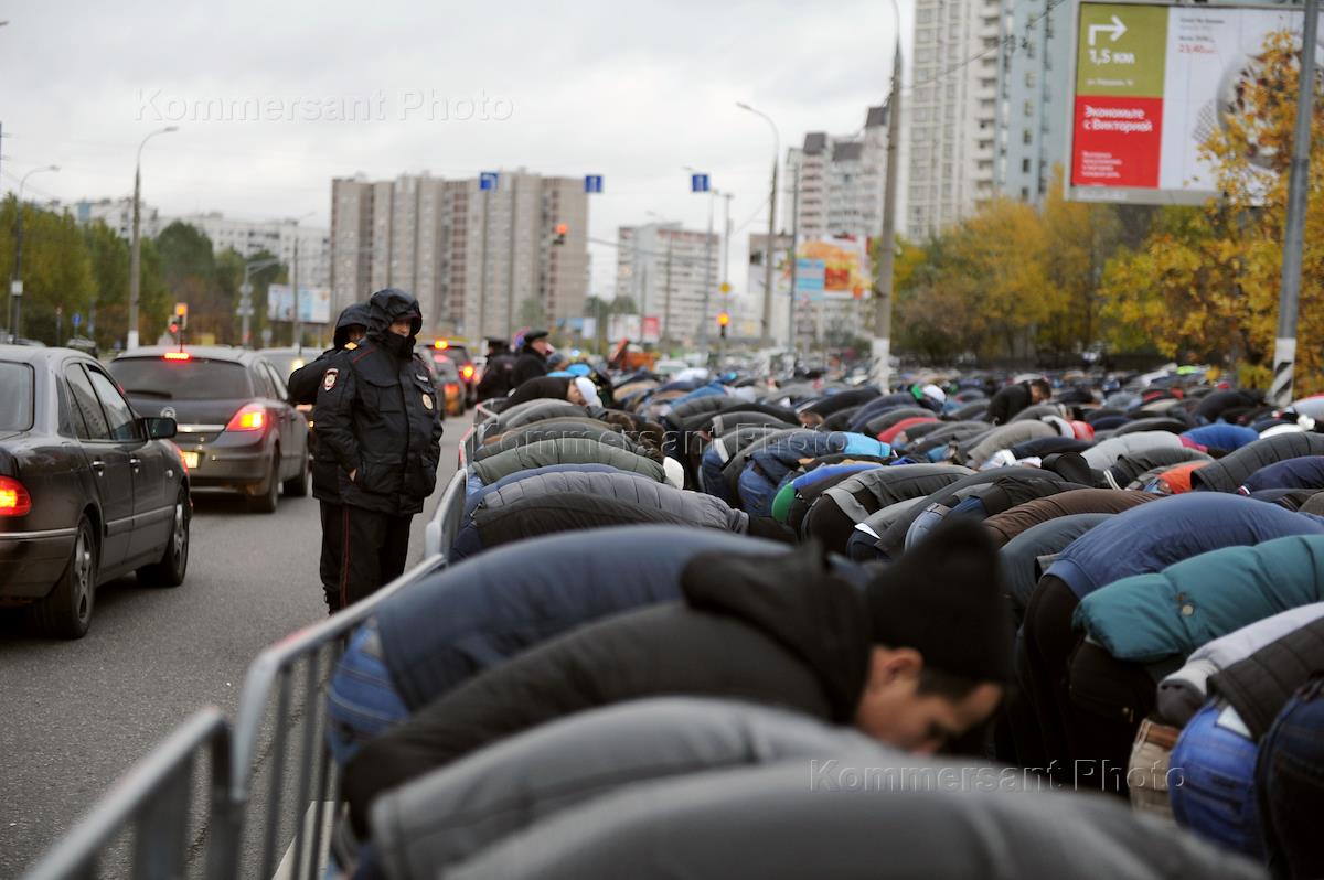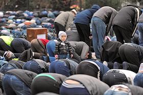 Мусульманский праздник жертвоприношения Курбан-Байрам. Верующие во время праздничного намаза у…