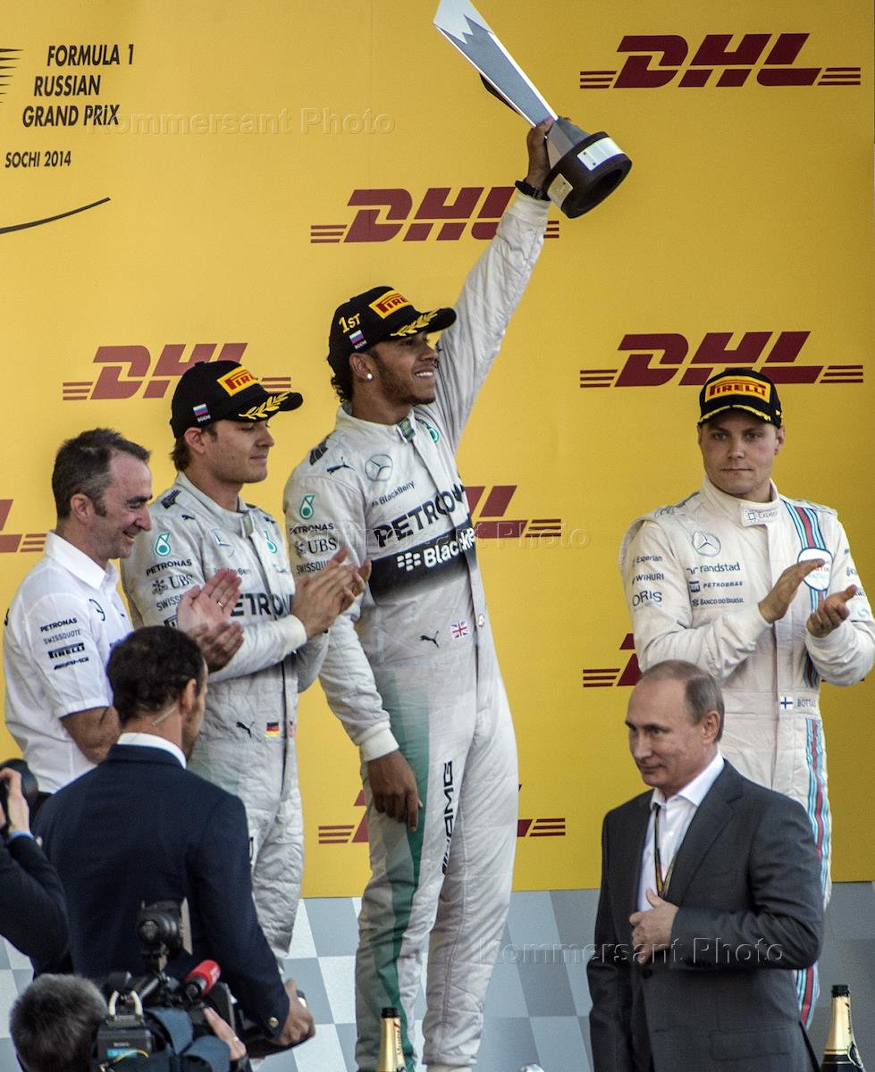 Гран-при России "Формулы-1" в Сочи. Слева направо: президент России Владимир Путин, гонщики команды…