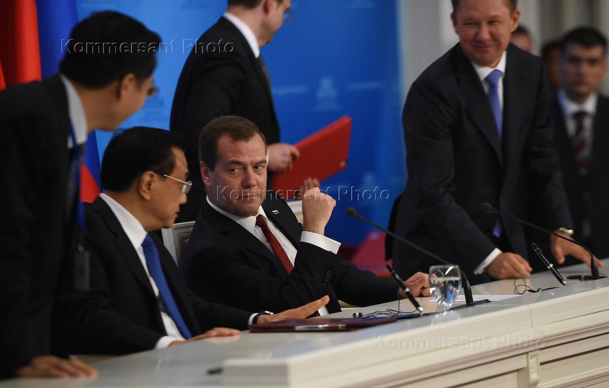 Председатель правительства России Дмитрий Медведев (слева) и премьер Государственного совета КНР Ли…