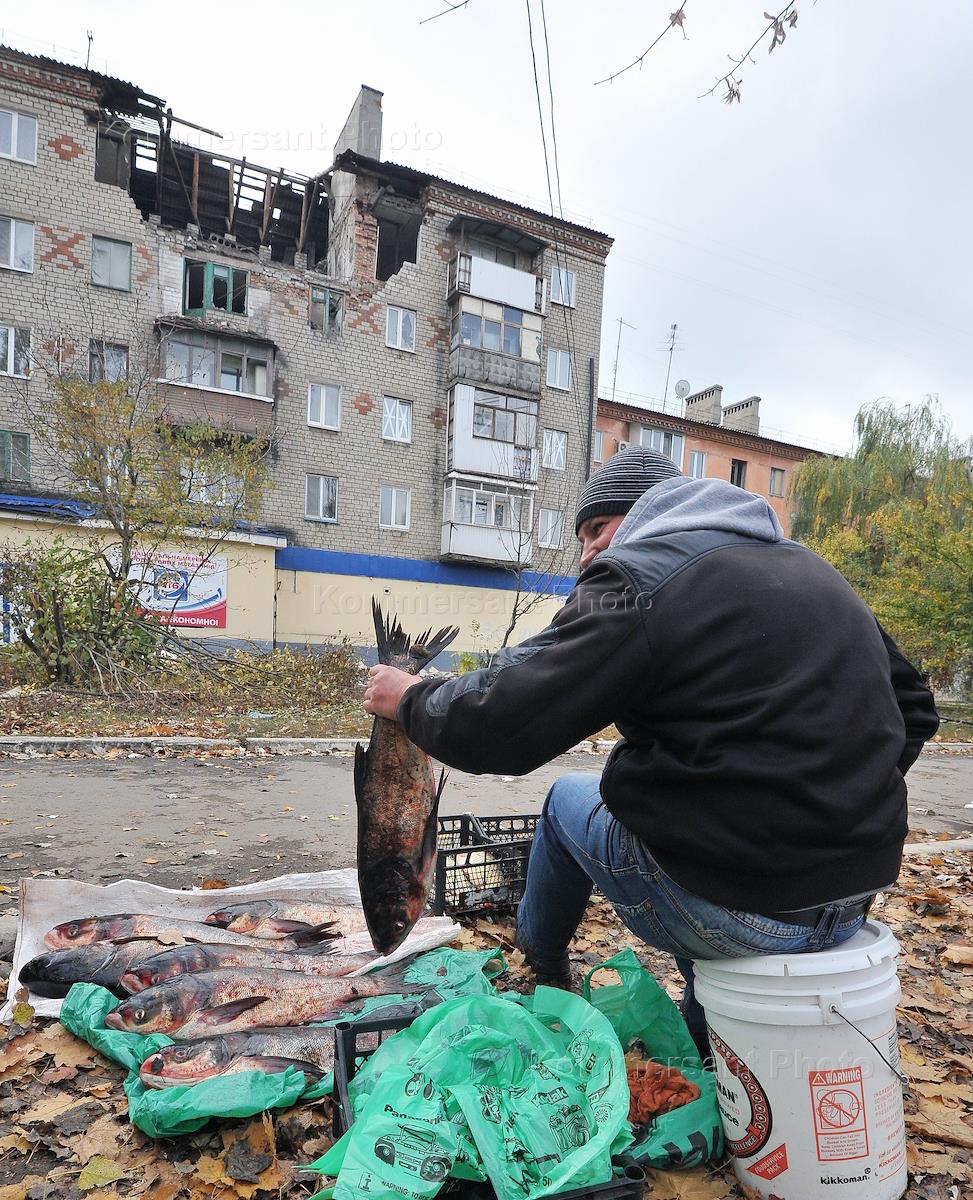Последствия обстрела территории Донецкой области Украинскими военными. Мужчина продает на улице…