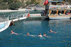 Турция. Жанровая фотография. Отдыхающие купаются в море у прогулочной яхты.