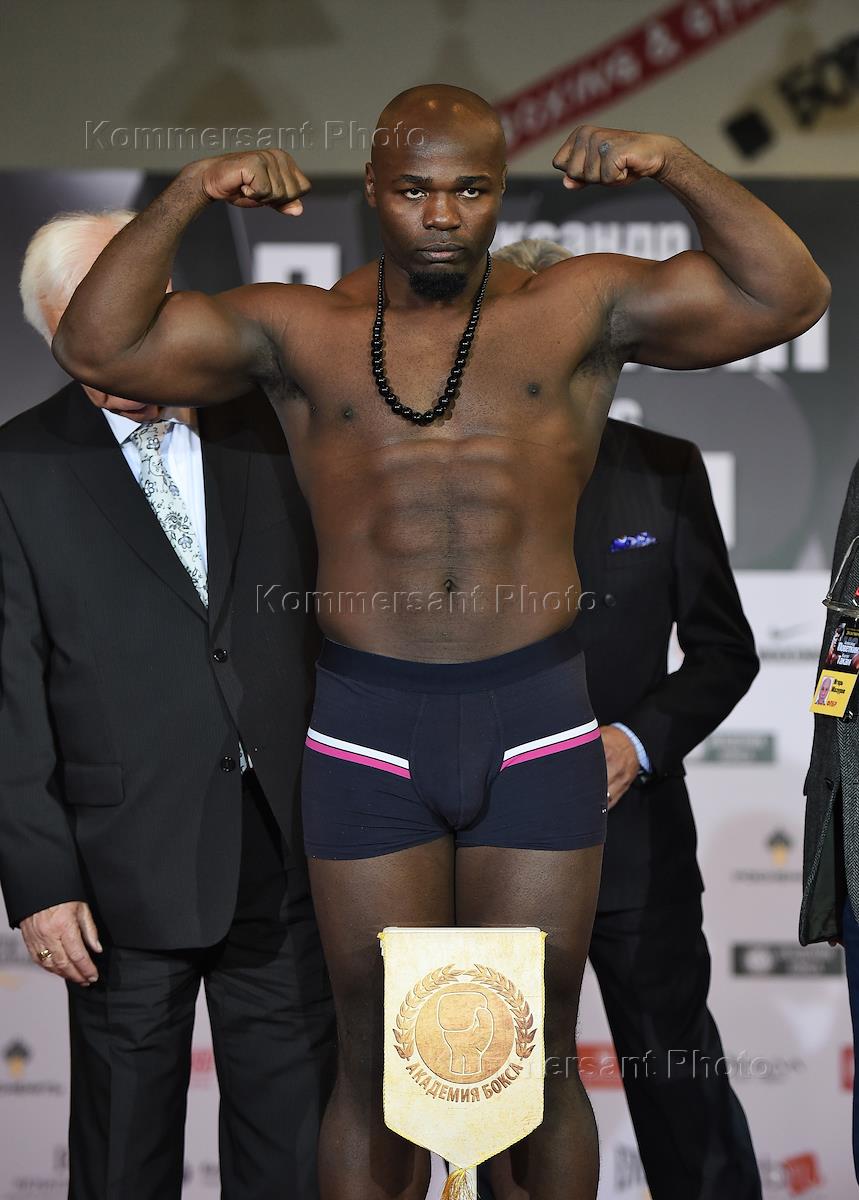 Спорт Официальная процедура взвешивания перед поединком российского боксера Александра Поветкина против камерунца Карлоса Такама за титул WBC Silver в тяжелом весе, в Академии Бокса «Boxing & Gym».