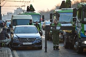 Жанровая фотография. Рабочие во время работы связанной с эвакуацией автомобиля на улице города.