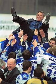 Тренер московского "Динамо" Зинэтула Билялетдинов на руках игроков и членов команды после завершения…