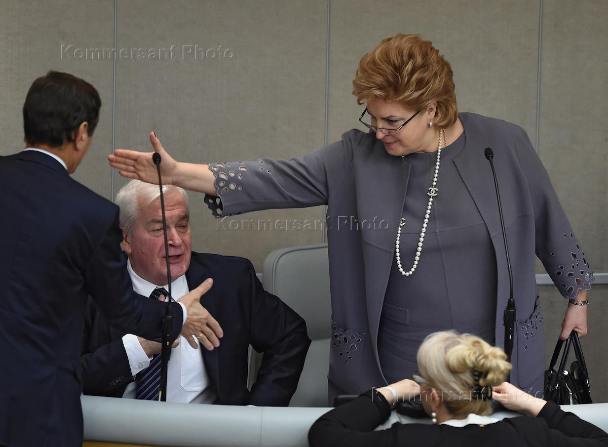 Первый заместитель министра финансов России Татьяна Нестеренко (справа) на пленарном заседании…