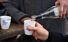 Подготовка к Рождеству в Париже. Рождественские базары на Елисейских полях. Мужчины пьют вино.