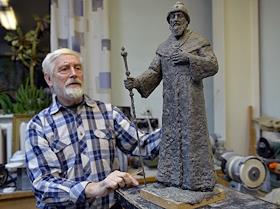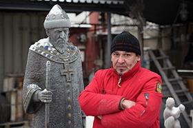 Cкульптор Олег Уваров со своим памятником российскому царю Ивану IV (Грозному) на территории…