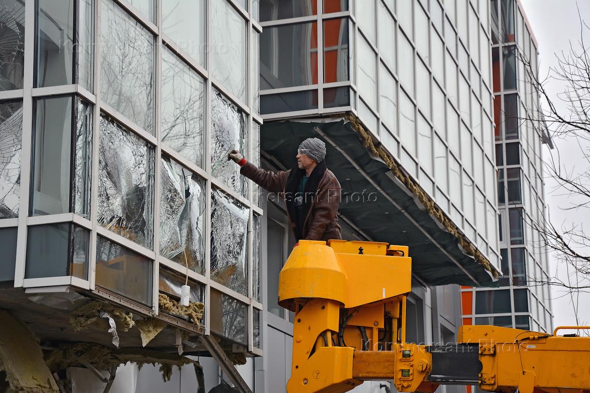 Разрушенное в результате взрыва здание офиса общественной организации "Волонтерская сотня Далии…