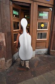 Жанровая фотография. Музыкант с виолончелью в футляре у входа в метро.