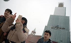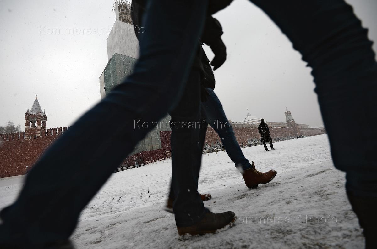 Жанровая фотография. Снегопад в Москве. Туристы на Красной площади.