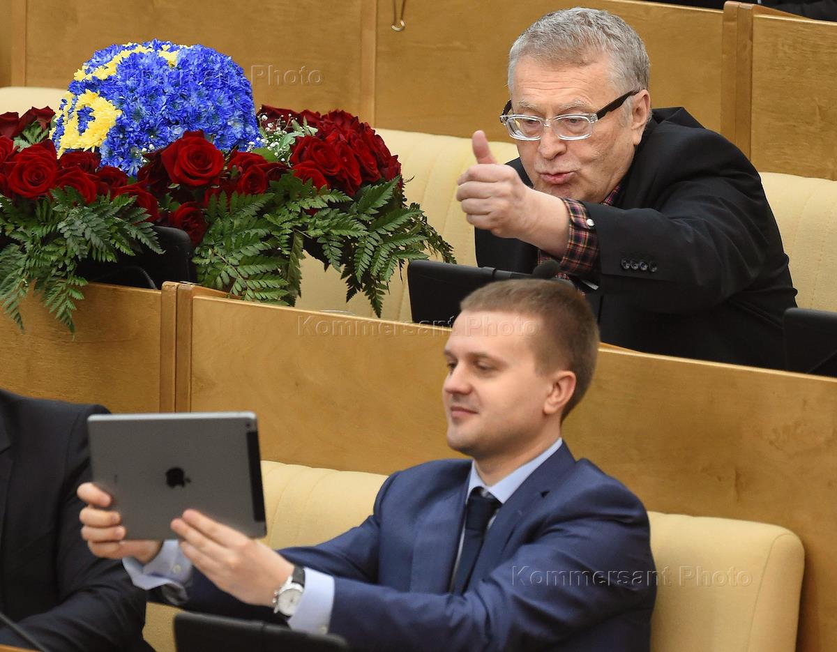 Пленарное заседание Государственной думы России. Слева направо: член комитета Государственной думы…
