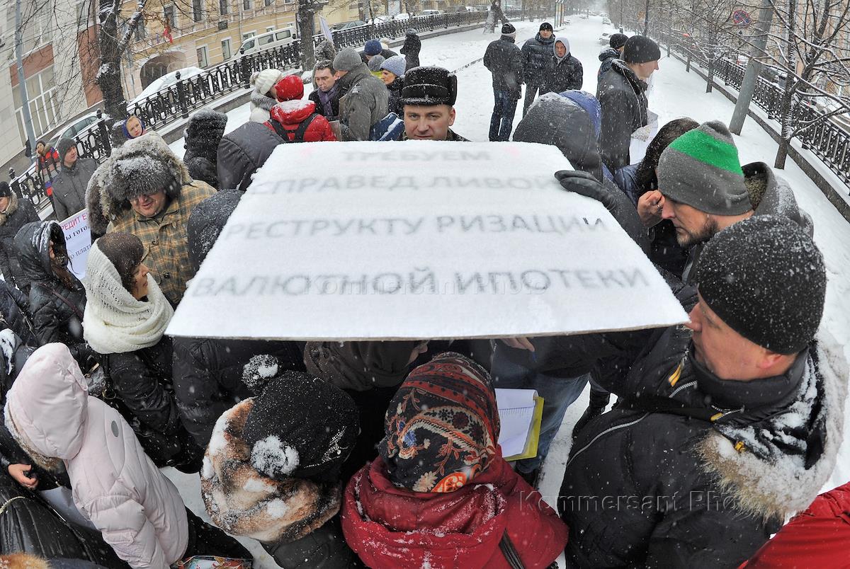 Пикет, организованный представителями группы валютных ипотечников, у Здания Центрального банка РФ.
