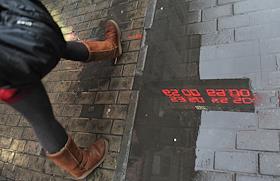 Жанровые фотографии. Отражение электронного табло пункта обмена валют с курсом доллра и евро в луже.