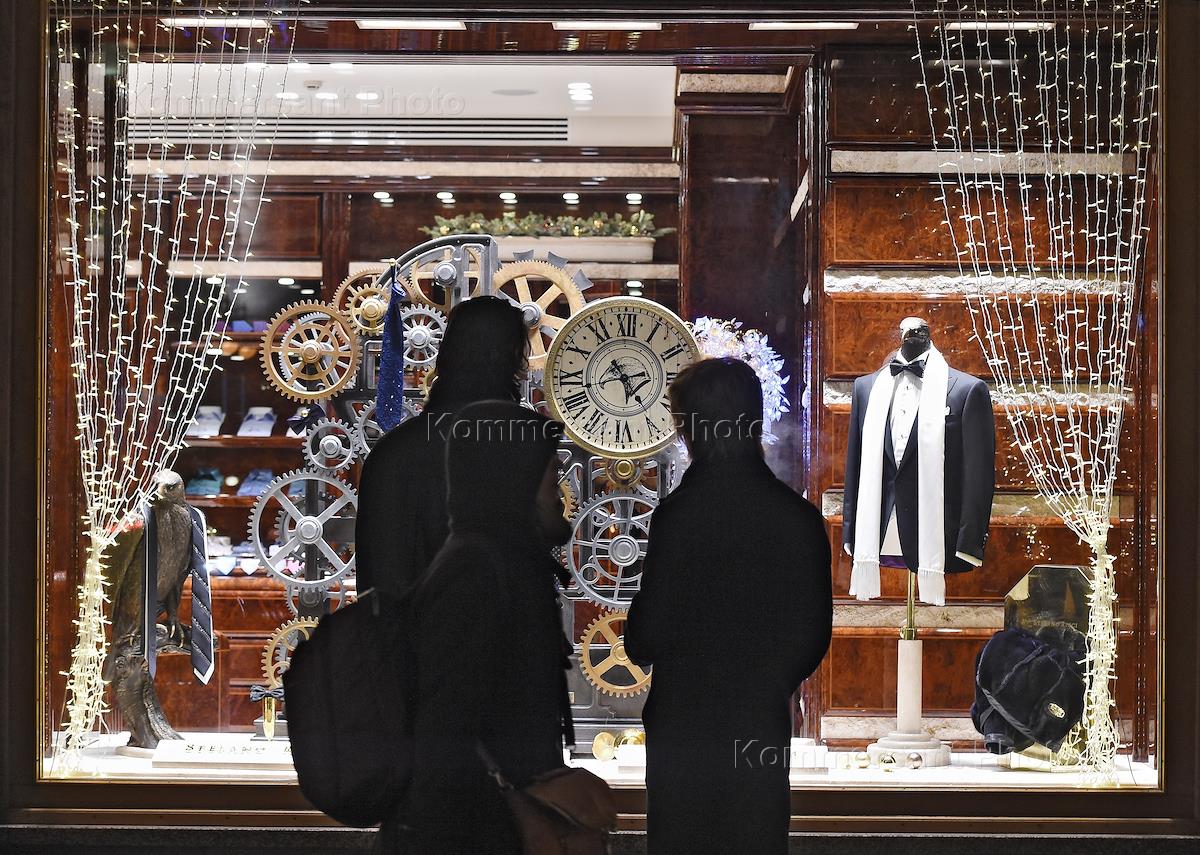 Жанровая фотография. Прохожие у новогодней витрины магазина мужской одежды.
