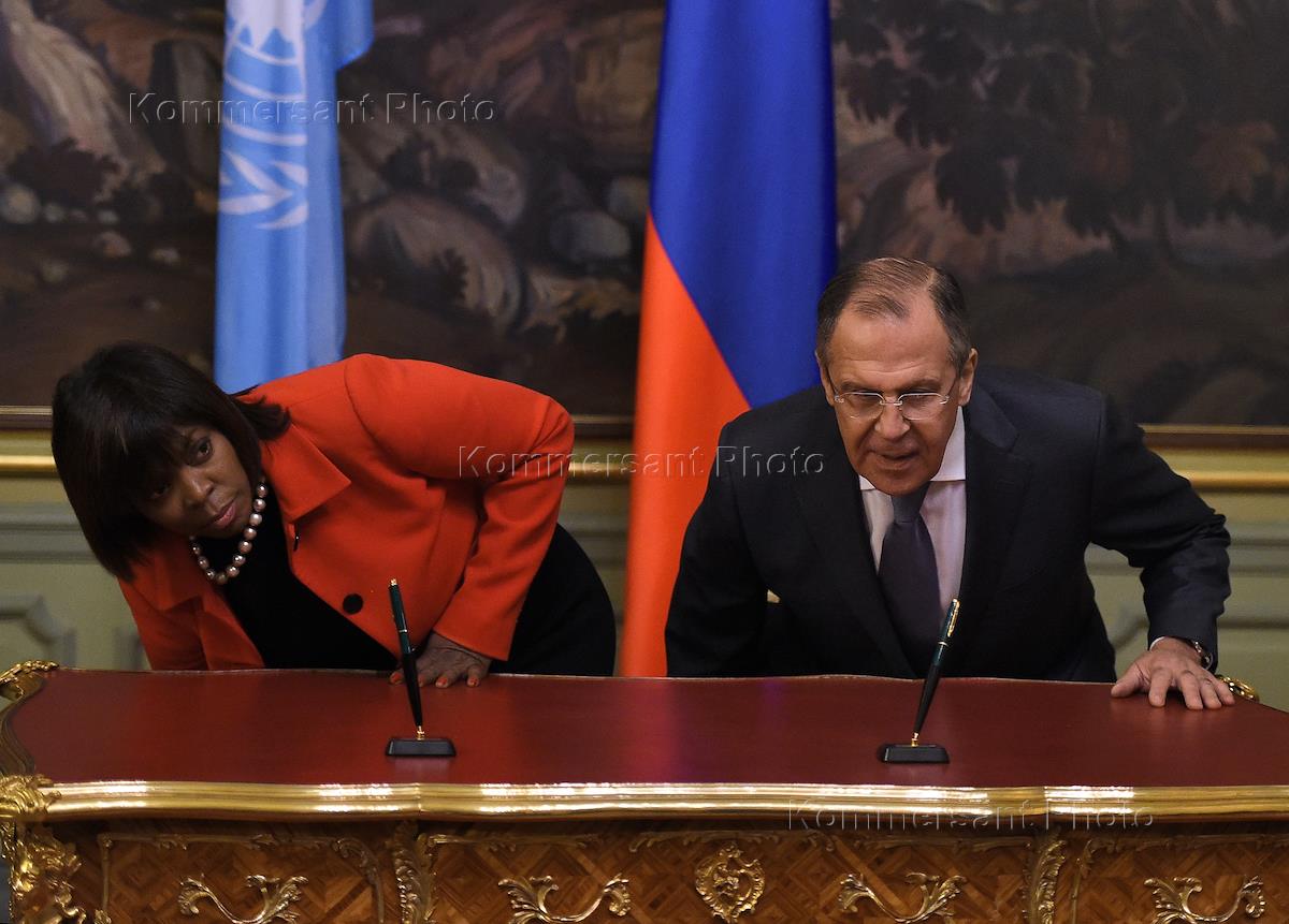 Политика Встреча министра иностранных дел России Сергея Лаврова с исполнительным директором Всемирной продовольственной программы (ВПП) ООН Эртарин Казин. Здание Центробанка России.