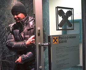 Мужчина выходит из отделения "Райффайзен банка" на Песчаной площади.