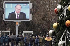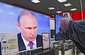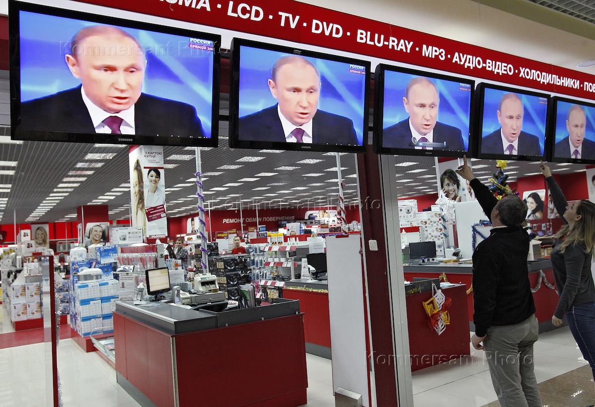 Пресс-конференция президента России Владимира Путина (на экране). Продажа техники в магазине.