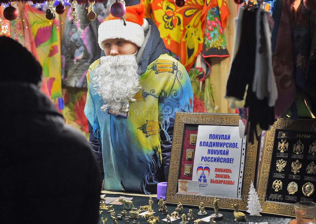 Торговля сувенирами на широкой Рождественской ярмарке на Соборной площади.