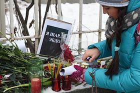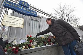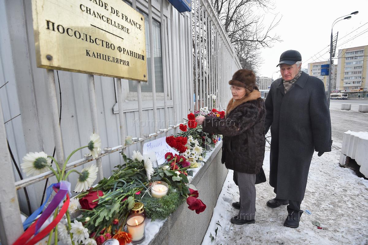 Цветы у посольства Франции в Москве в знак траура по расстрелянным во Франции сотрудникам журнала Charlie Hebdo.